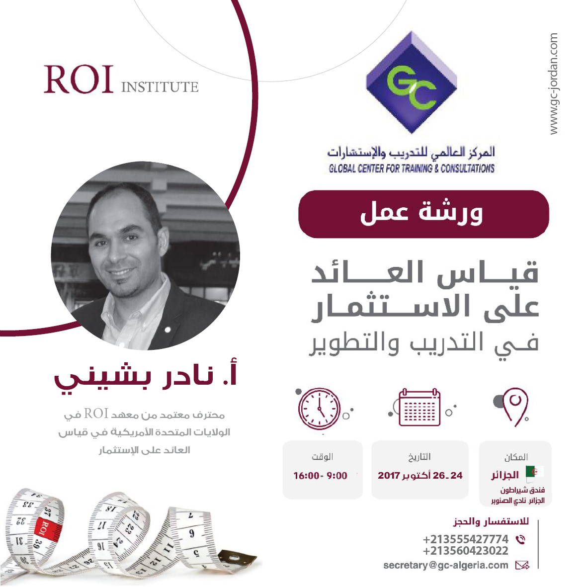 يعقد المركز العالمي للتدريب والاستشارات ورشة عمل في قياس العائد على الاستثمار ولاول مرة في الجزائر وشمال افريقيا في الفترة من 24-26/اوت/2017 فندق الشيراتون -نادي الصنوبر