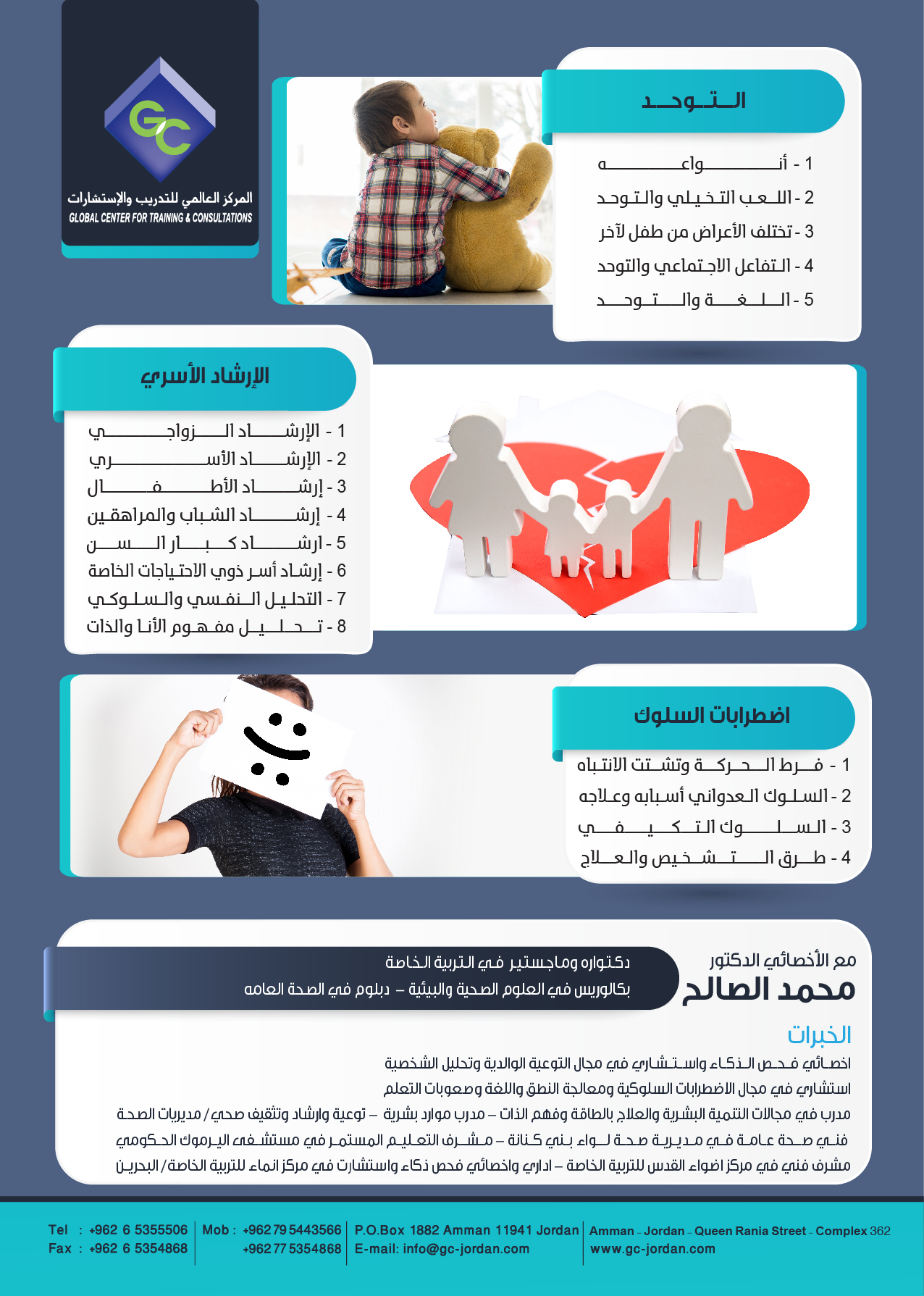 يعقد المركز العالمي للتدريب والاستشارات جلسات استشارية علاجية مع د.محمد صالح في مقر المركز -شارع الجامعة الاردنية قبل اشارة الدوريات الخارجية سابقا