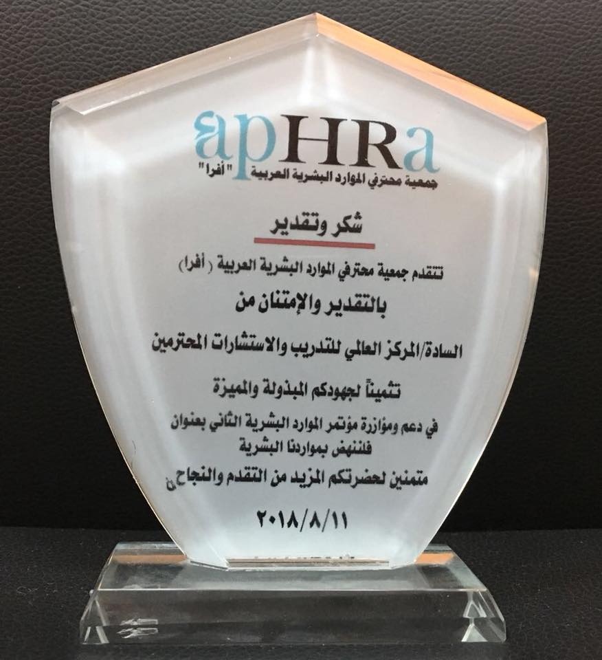 Global Center for Training and Consultations represented by its CEO/Dr. Raed Khanfar received the honorary trophy for the golden sponsorship of the annual conference scheduled to be held in the Jordanian capital Amman, under the title of "Lets rise with our Human Resources".